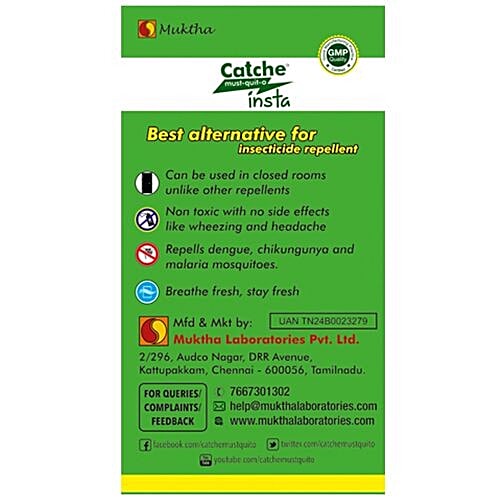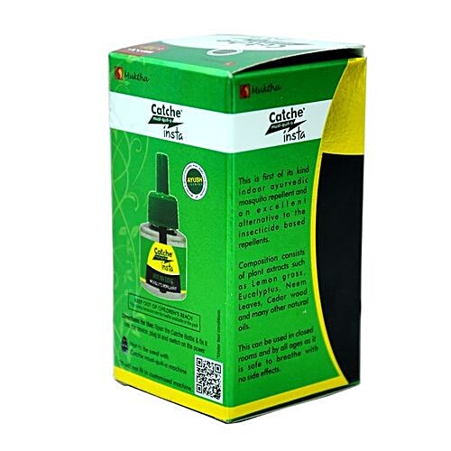 About @import url("https://www.desercart.com/static/froala_style_v2.min.css"); Catche Insta Ayurvedic Repellent effectively eliminates all mosquitoes, making it less likely to cause diseases like Dengue, Chikungunya, or Malaria. The repellant is fit to be used in a closed room as it does not cause side effects like wheezing or headache. It fits all machines and is an excellent alternative to insecticide and chemical based repellents. It contains no transfluthrin and is safe for children. Composition @import url("https://www.desercart.com/static/froala_style_v2.min.css"); Plant Extracts Such As Wild Turmaric, Lemongrass Oil, Basil Oil, Citronella And Other Natural Oils. How to Use @import url("https://www.desercart.com/static/froala_style_v2.min.css"); Fix the Catche MUST-QUIT-O Insta Ayurvedic Repellent in a machine, of any brand, and simply switch it on. It does not fit with the Catche MUST-QUIT-O machine as there is a separate repellent available for it.