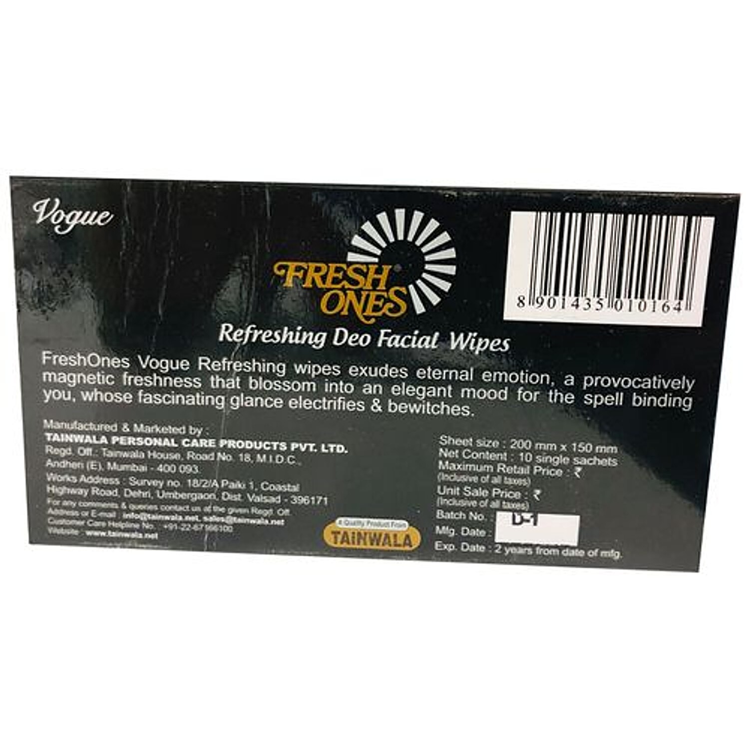 About the Product @import url("https://www.desercart.com/static/froala_style_v2.min.css"); FreshOnes Vogue Wipes exude eternal emotion, a provocatively magnetic freshness that blossoms into an elegant mood for spellbinding you and whose fascinating glance electrifies and bewitches you. How to Use @import url("https://www.desercart.com/static/froala_style_v2.min.css"); Gently rub wipes in a circular motion. When using face wipes, rub them gently in a circular motion all over your face. You may need to use multiple wipes in order to remove all of the makeup, oil, and grime from your face. Look at each wipe after it has been applied to your face.