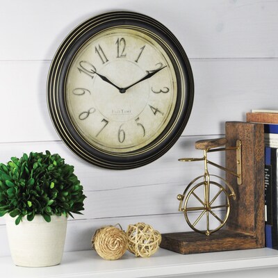 Description The black FirsTime 25516 Plastic Analog Distressed Wall Clock bears the classic analog display that enables you to read the time even from a distance. Tan face and Arabic numerals of the round wall clock well-complements its case Battery for ease of use Dimensions: 9.75"Dia. x 2"D Comes with a 60-day warranty Specifications Clock & Timer Type : Wall Clock Clock Style : Traditional Height (in.) : 9.75 Clock Case Material : Plastic Depth (in.) : 2 Clock Case Color : Black Clock Face Color : Brown Mechanism Power : Battery Clock Battery Type : AA Clock Number Type : Arabic Clock Special Features : Arabic Numerals Clock Theme : None Second Hand : No Diameter (in) : 9.75 Brand : FirsTime Customizable : No Weight : 13.65 lbs. per Each