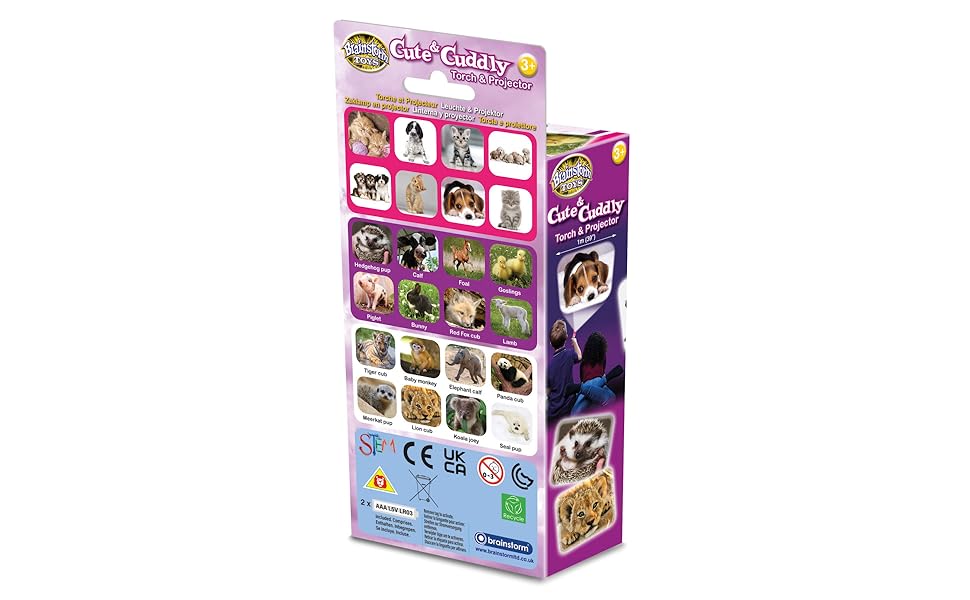 This compact and lightweight flashlight-projector combo projects 24 vibrant, cute animal images onto walls and ceilings with crystal-clear focus up to one meter wide. It includes three interchangeable slide discs, comes with batteries installed, and features multi-lingual instructions, making it an ideal educational toy for kids aged 3 and up.