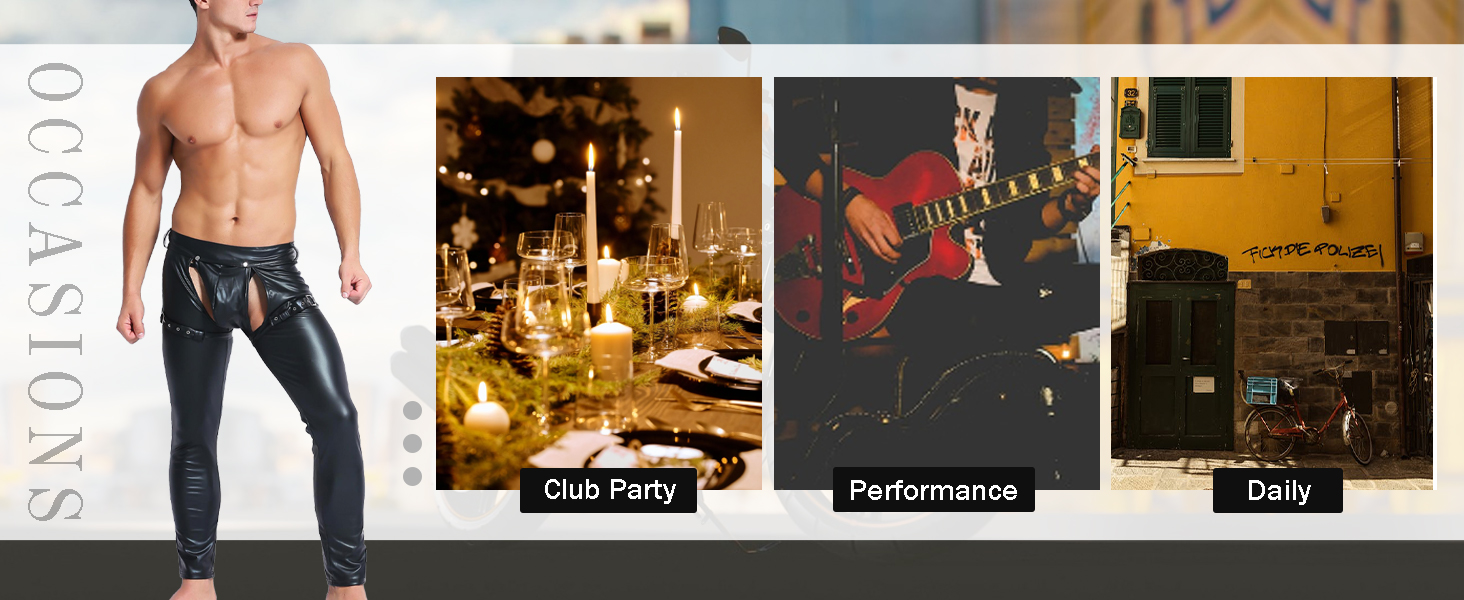 Mens Skinny Pants Faux Leather Open Crotch Trousers Long Pant with Bulge Pouch for Men