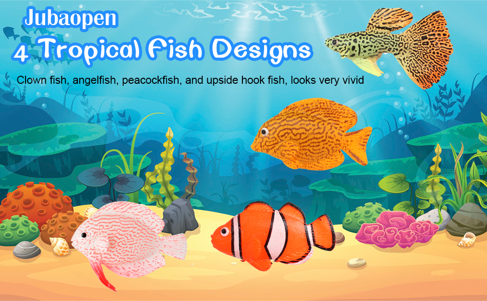 The Jubaopen 4-piece artificial tropical fish set features four distinct, vividly colored silicone fish that float naturally in water. Made from durable, non-toxic materials, these realistic decorations enhance any freshwater or saltwater aquarium, adding dynamic movement and a splash of color to your aquatic environment.