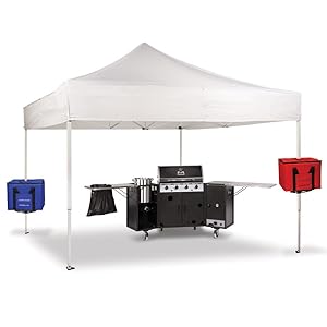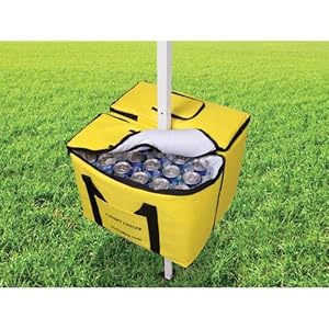 The Canopy Cooler Shade Canopy Weight and Cooler All In One is a versatile 18 x 18 x 14 inch cooler with a 48 can capacity. It features dual insulated compartments for optimal temperature control, quick access flaps for easy retrieval, and a unique design that mounts directly to your shade canopy for stability in windy conditions. The adjustable self-locking tables ensure easy access while keeping your cooler elevated and protected from the elements.