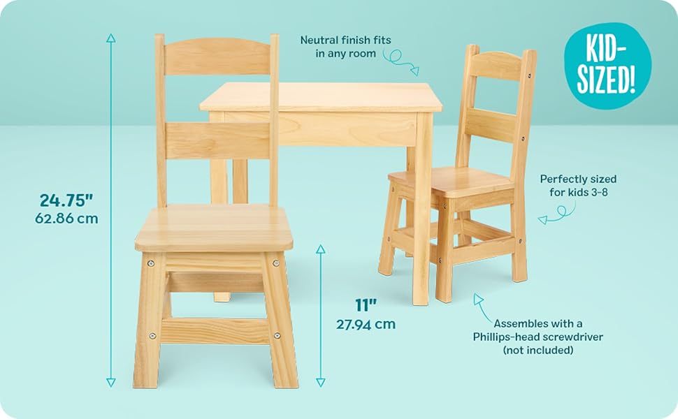 Melissa & Doug’s Solid Wood Table and 2 Chairs Set is a durable, easy-to-assemble kids’ furniture trio designed for ages 3 to 8. Made from solid wood with a sturdy build supporting up to 100 lbs per chair, it promotes screen-free play and creativity. Available in multiple finishes, it blends seamlessly into any home while providing a reliable, stylish space for arts, crafts, and social play.