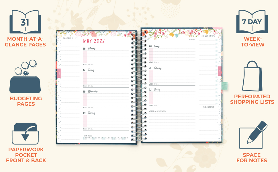 This is the best diary I have ever bought and I am really fussy. I always buy academic ones because I work in school. but I have a very busy life both in school and out. I have everything at my finger tips in this diary and more. It starts with a page for useful numbers with many listed which was helpful because I forget about breakdown recovery! Then you have a few pages where you can enter your weekly routines. Followed by the start of the diary, Its two pages for a week, on either side there are detachable list you can tear off, so as the week goes on you can write your shopping lists. I love a list. I plan my weekly menus as well and there is a place for you to write dinner ideas. The next section and it is a section, you have a monthly overview, pages for notes and a proper income and outgoings page. And then my favourite bit, you have a Christmas and holidays sections, Christmas shopping lists, planning pages and notes. There is a pocket on the front and back cover. I always need a pocket to keep my appointment letters safe in. The back pocket in this diary has two pages of useful sticker, for all sorts of occasions and it also has a little address and contacts book. Again, all you could possible need at your finger tips. I will never buy another diary and am so thrilled with this one and after the last few months of lock down this have been a very beautiful thing to receive and fill in and has really cheered me up! Thank you Boxclever Press, you now have a life long customer.