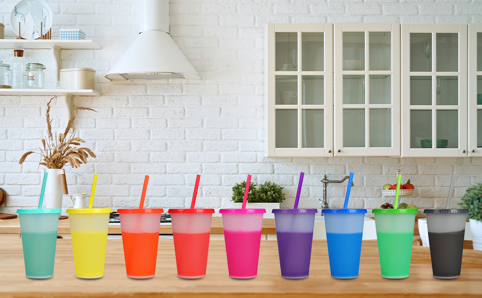 These 16 oz reusable plastic tumblers feature a mesmerizing color-changing effect that activates with cold drinks. Designed for durability and eco-friendliness, they are spill-proof, stackable, and dishwasher-safe—perfect for both kids and adults at home or parties.