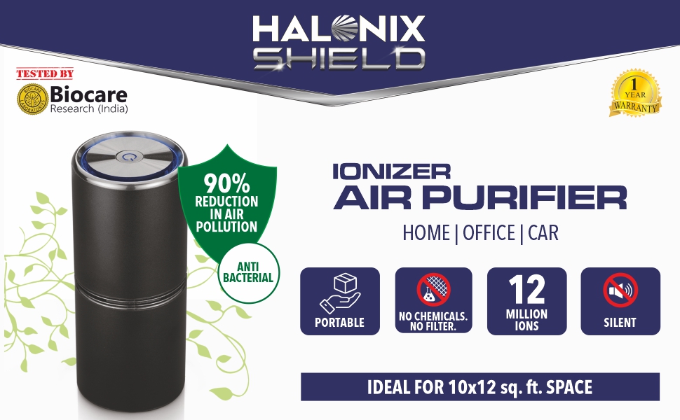 The Halonix Shield Portable Ionizer Air Purifier releases 12 million negative ions to neutralize 99.9% of viruses and bacteria while removing 90% of PM2.5 pollutants. Designed for compact spaces up to 10 sq. ft., it operates quietly at 30 dB with a low 5W power draw. Ideal for home, car, or office use, its sleek black design and touch controls make it a stylish, energy-efficient solution for cleaner, healthier air wherever you go.