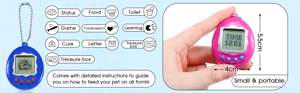 Features: Virtual pet: You will own yourself pet, you need to take care of feeding, studying, playing etc., suitable for the children over 12. Great fun: You can enjoy the process of keeping a pet, also you can play with friends like party or school game. Convenient to carry: You can take it to everywhere with keychain, small size measures 5.5 x 4.5 x 1.2 cm, just take up small space. Easy to operate: Only 4 buttons, reset, select, decide, and cancel, with the paper specification. Specifications: Material: PVC plastic Package: bag Package includes: 3 x Virtual pet machine (batteries are included) Warm notes: 1. Take off the battery isolated paper under the botton battery in case of no charge for the toy. 2. The product color will not same from the picture, because the the computer's screen is different. 3. Suitable for the children over 12.
