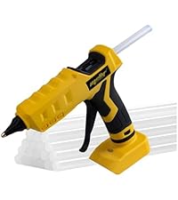 At first I was sceptical about how well it would work given the price and being an unknown brand to me, but I was pleasantly surprised. It gets hot faster than my plug in hot glue gun, and gets hotter than my plug in glue gun. It's got a switch on the side so you can turn it on and off as needed and has an led indicator light that's red when heating up and turns green when it's hot. The battery acts as a nice stand for it so you can just set it down on any flat surface without having to pull down a lever/arm to set it on a table without the tip touching. I can't speak for the quality of the glue sticks that come with it as I opted to use the ones I already had, which are high temp glue sticks. This glue gun makes quick work of them. The only thing I noticed that it's lacking Compared to my plug in glue gun is how much/how fast it can dispense hot glue. It's not as fast, but that's honestly a good thing for what I use it for, but can be an issue if you need lots of hot glue in a short time. It's very close though so most people won't even notice the difference. It seems to be good in terms of battery usage, as I've yet to drain my battery. The portability of it makes it a game changer. No outlets or docking stations needed. Just turn it on, wait for the green light which takes about 60 seconds and you are ready to get gluing. Overall, I recommend this hot glue gun to anyone who has battery power tools that it's compatible with, which is Dewalt, milwaukee and makita 18/20v lithium batteries. Even if you don't use a hot glue gun often, it's worth having around just because it's useful when needed. Review update: tried the glue sticks that come with it and they are no good for This glue gun. I think they are low temp glue sticks because they have caused clogs in both of my glue guns. When they dry, the adhesive isn't very strong compared to what I normally use. It feels like rubber. For craft applications they are not bad, but for heavier work they would not be ideal. I personally recommend using AdTech crystal clear glue sticks which aren't expensive and work much better. After using this glue gun for several weeks now, I'm still thoroughly impressed with it. I still cannot get an accurate assessment of battery life because I often share batteries between tools.