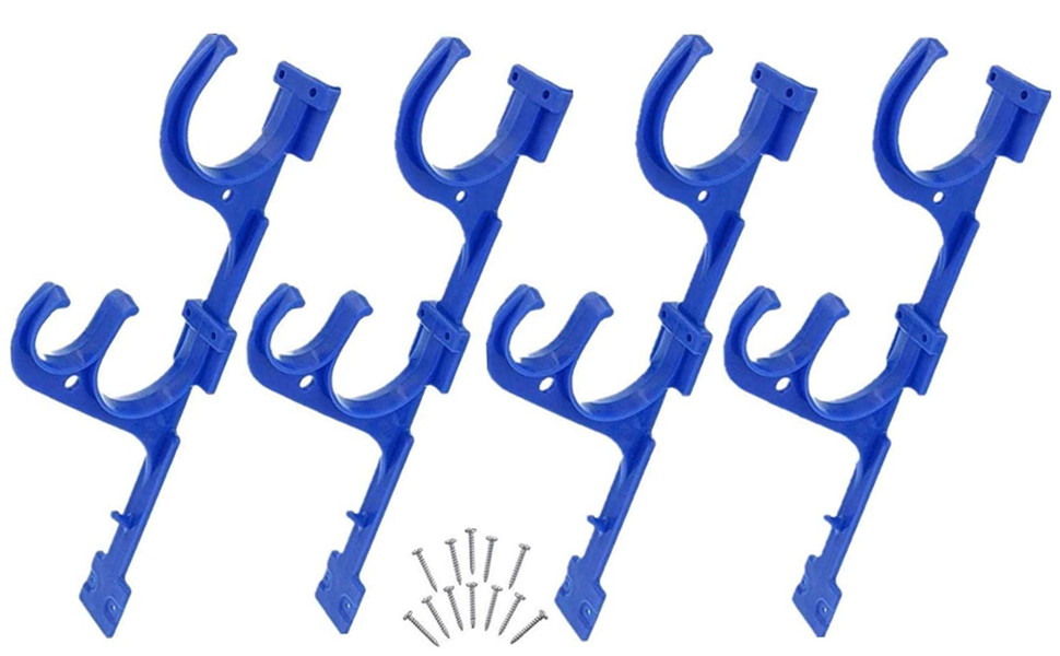 The MENG ZHI AO 4-piece pool pole hanger set features rust-resistant screws and durable dark blue plastic hooks measuring 31cm each. Designed for versatile use, these lightweight holders easily mount on wood, metal, concrete, or decks to neatly store pool poles, skimmers, brushes, garden tools, and more—making outdoor organization stylish and simple.