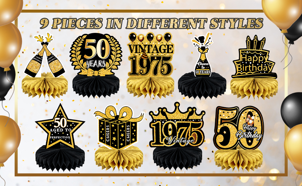 - 💖50th BIRTHDAY PACKAGE INCLUDES: Our 50th birthday decorations including 9 patterned cardboard and 9 paper honeycombs. These decorations exquisitely designed with interesting birthday elements. It is very suitable as a decoration for your 50th birthday party favor supplies, you can place it on the table or hang it with a clip