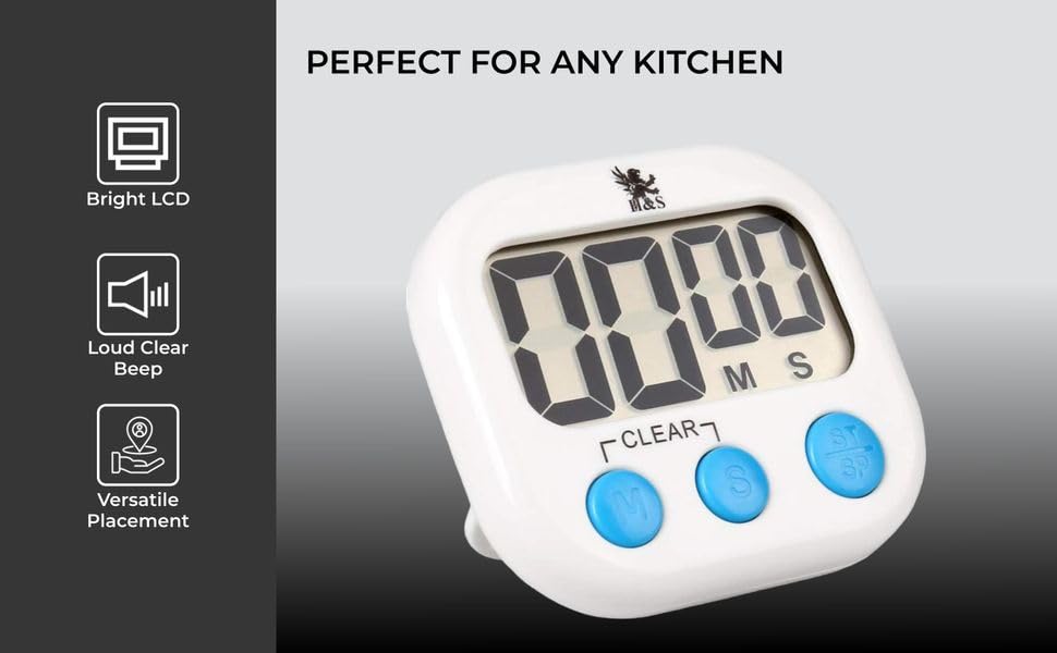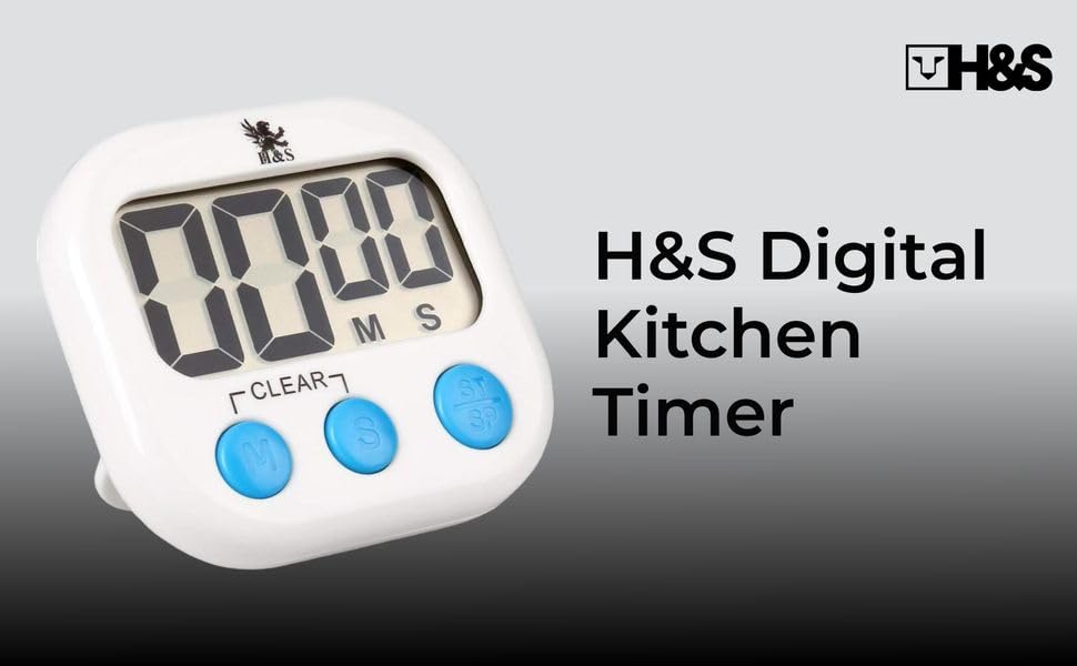 The H&S Kitchen Timer is a multifunctional digital timer featuring a large LCD display, loud alarm, and versatile magnetic and clip placement options. Designed for both cooking and classroom use, it offers precise countdown capabilities up to 99 minutes and 59 seconds, ensuring a reliable and efficient cooking experience.