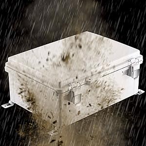 The Junction Box is a robust IP67 waterproof plastic enclosure designed for both outdoor and industrial applications. Measuring 370×270×150mm (14.6"×10.6"×5.9"), it features a hinged grey cover, stainless steel latches for watertight security, and a mounting plate for easy installation of electrical components. Made from high-grade ABS plastic, this enclosure is lightweight yet sturdy, ensuring your projects are protected from the elements.