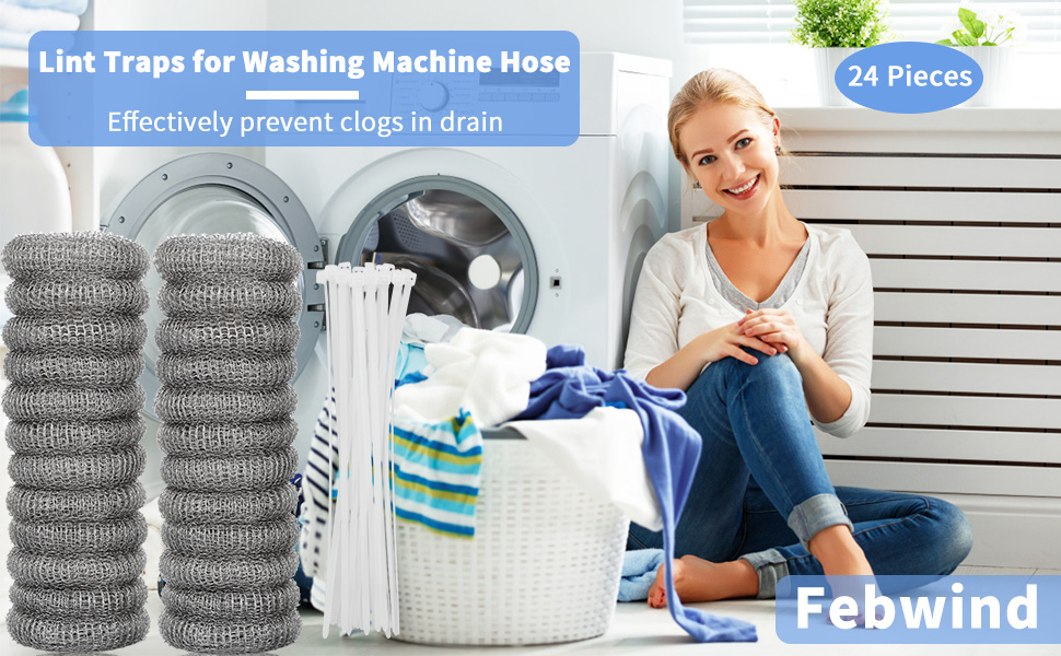 The Febwind 24 PCS Lint Traps are rustproof stainless steel mesh filters designed to fit washing machine hoses with diameters between 1.0" and 2.1". This comprehensive kit includes 24 traps and cable ties, providing an easy, tool-free installation solution that effectively captures lint, hair, and debris to prevent drain blockages in hoses draining into sinks or basins.