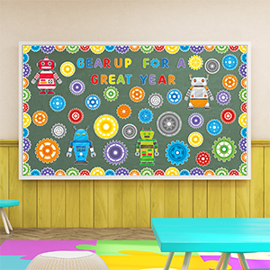 This is a pre-designed set of pieces for a classroom bulletin board. It has robots and gears. What kid doesn't love robots?I appreciate the eay-catching color and whimsical images of the set.Teachers love to make up their own themes for their bulletin boards, but these days they don't often have time for it. This set offers a solution. If mounted and removed carefully, it could last for a really long time.I am very satisfied.
