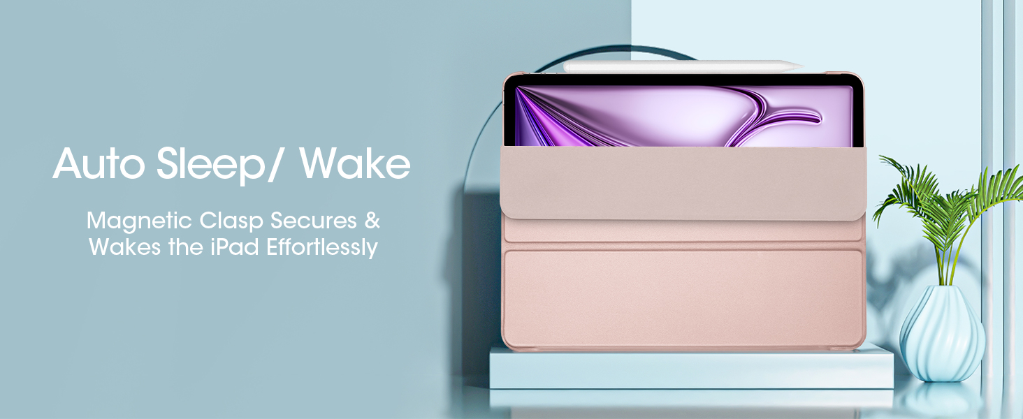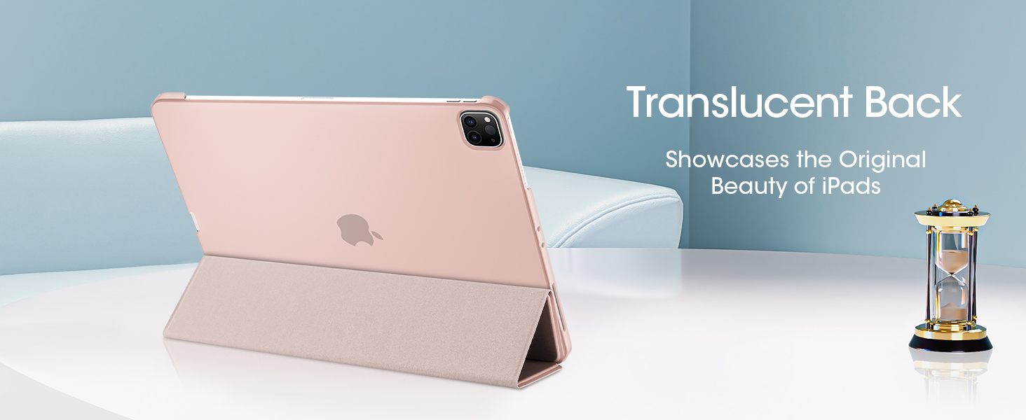 The ProCase Smart Case for iPad Air 13 Inch (M3/M2) and iPad Pro 12.9 Inch (3rd-6th Gen) combines ultra-slim, lightweight hard back protection with a translucent frosted finish that showcases the Apple logo. It supports 2nd Gen Apple Pencil magnetic attachment, wireless charging, and auto Sleep/Wake, while offering dual standing positions and full access to all device features except the Smart Keyboard.