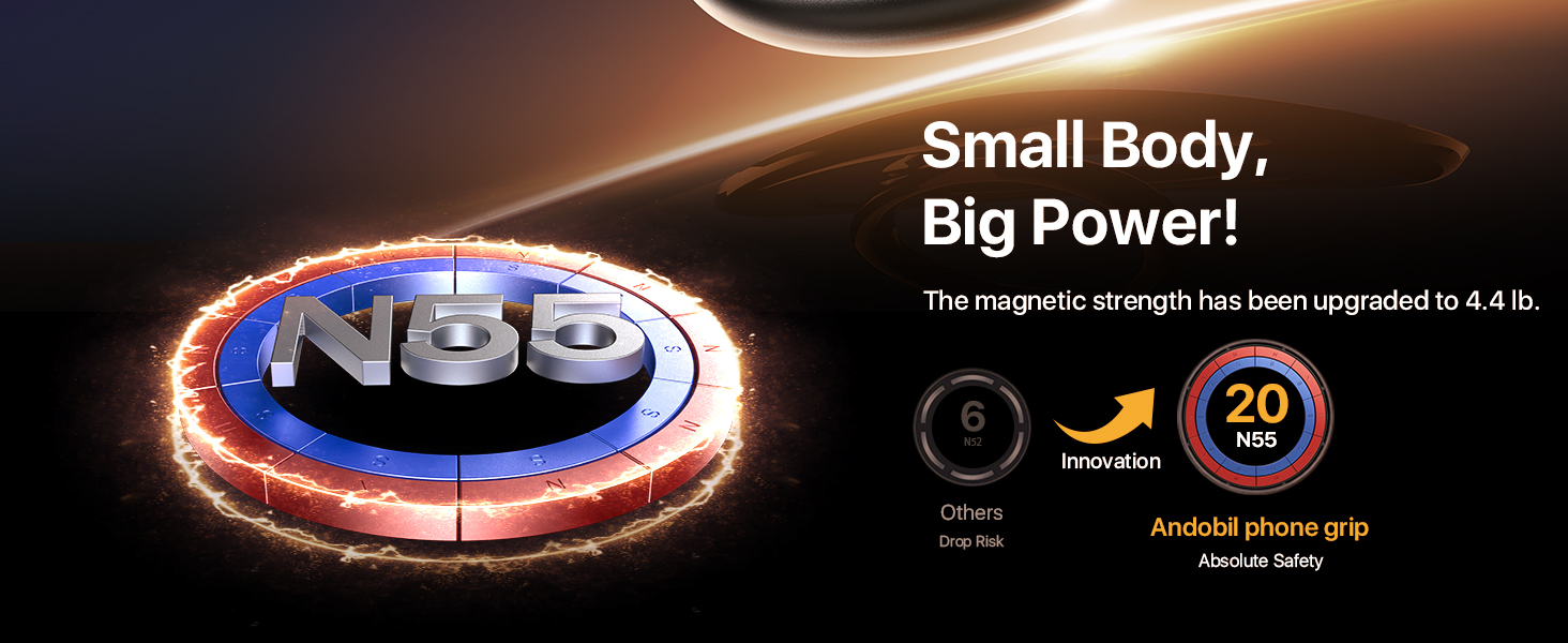 The andobil Upgraded Magnetic Phone Grip features premium N55 magnets delivering 30-35N magnetic force, dual-sided attachment with up to 6.6lbs hold, and a 360° rotatable, lockable ring tested for durability. Compatible with iPhone 12 through 16 series and Android phones via an included metal ring, it offers a secure, anti-fall grip that enhances hands-free convenience and wireless charging compatibility.