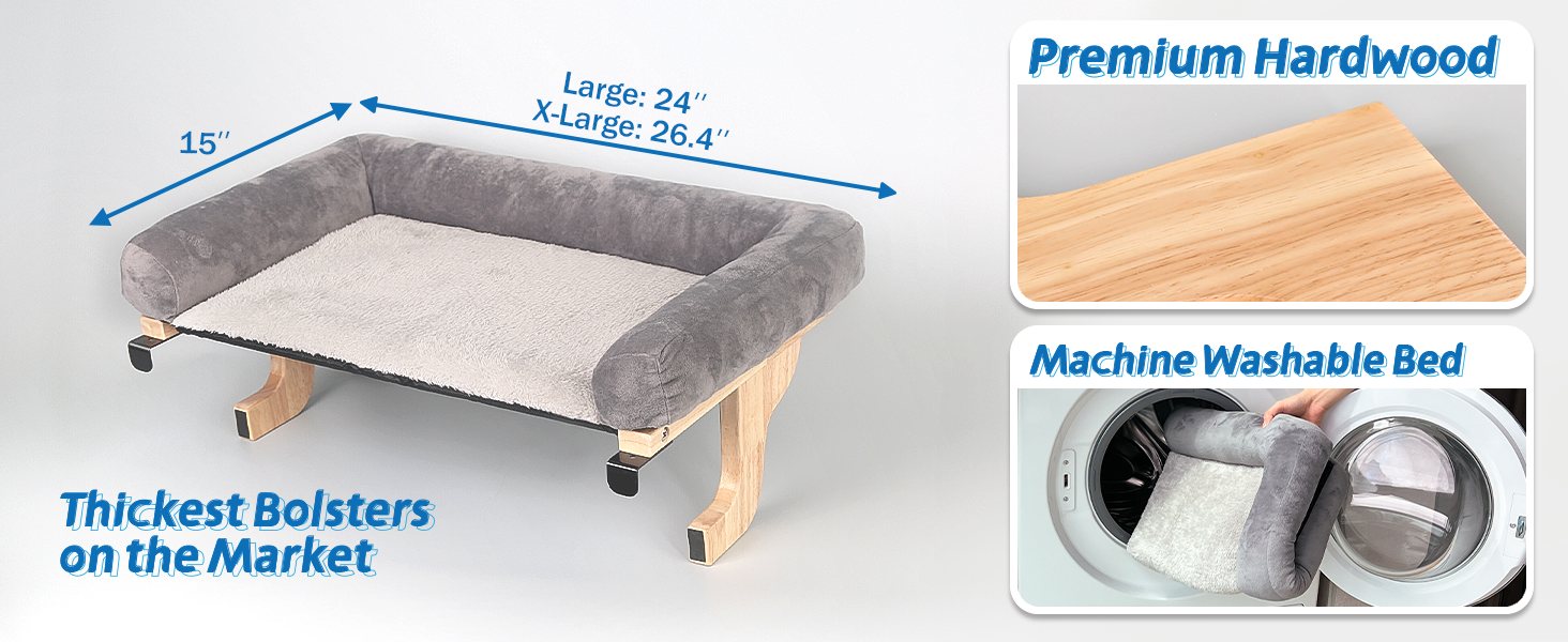 The Zakkart Cat Perch is a premium window seat designed for large cats and kittens, featuring a sturdy hardwood and metal frame that supports up to 40 lbs. Its orthopedic hammock design with plush bolsters offers superior joint support, while the no-drill adjustable hook system ensures easy, damage-free installation on window sills up to 9 inches deep. The 24'' x 15'' spacious bed invites your cat to lounge, play, and enjoy unobstructed outdoor views, all wrapped in a natural wood finish with a machine washable gray fabric bed.