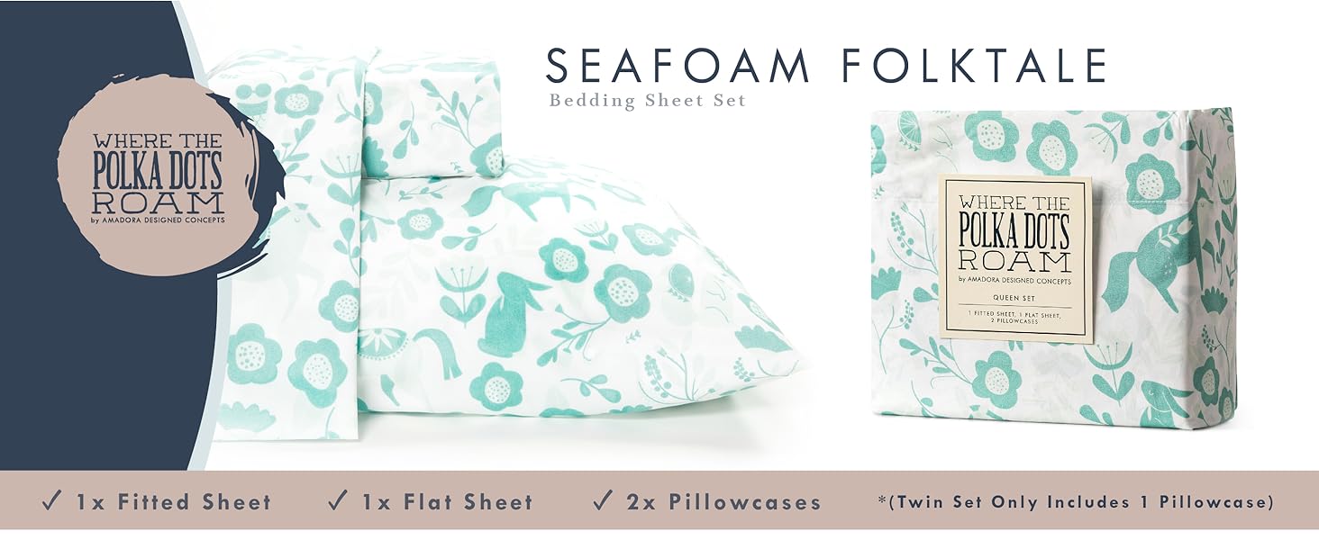 This full-size 4-piece bedding set features ultra-soft, double-brushed microfiber sheets with a secure 360° elastic fitted sheet designed for deep mattresses. The moisture-wicking, wrinkle-resistant fabric ensures cool, dry, and easy-care bedding, while the playful green polka dot folktale design adds a fresh, stylish touch to any kid’s bedroom.