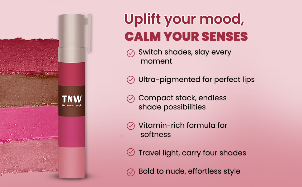 TNW The Natural Wash Lipstack 01 Playlist is a 4-in-1 mini lipstick featuring four versatile shades in one compact, stackable stick. Enriched with Vitamin E, Jojoba oil, and Shea butter, it delivers ultra-pigmented, transferproof color while moisturizing lips. Designed for easy shade switching and travel convenience, this lipstick is your all-day, all-occasion beauty essential.