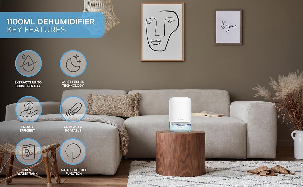 Upsides: Nice sleek design, great price of 32 pounds, colours work and it's very quiet.Downsides: you take it apart by picking up the top part so it may be easy to spill if you knock it over. Buttons have to be pressed hard to respond. It absorbs less water than other dehumidifiers of slightly higher price, but it looks better and is quieter. I am guessing it absorbs as much moisture as the better ones on quiet mode. The back cable detaches easily loosing power supply, but only when touched.