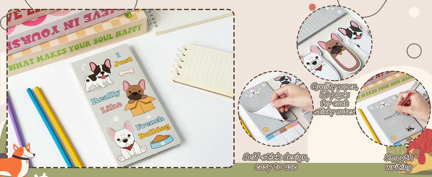 The I Just Really Like French Bulldog Sticky Notes Set includes 550 sheets of self-adhesive note pads in various fun designs. Each pad features a unique bulldog theme, crafted from premium paper for easy writing and long-lasting stickiness. Perfect for students, teachers, and anyone who loves a touch of whimsy in their organization tools.