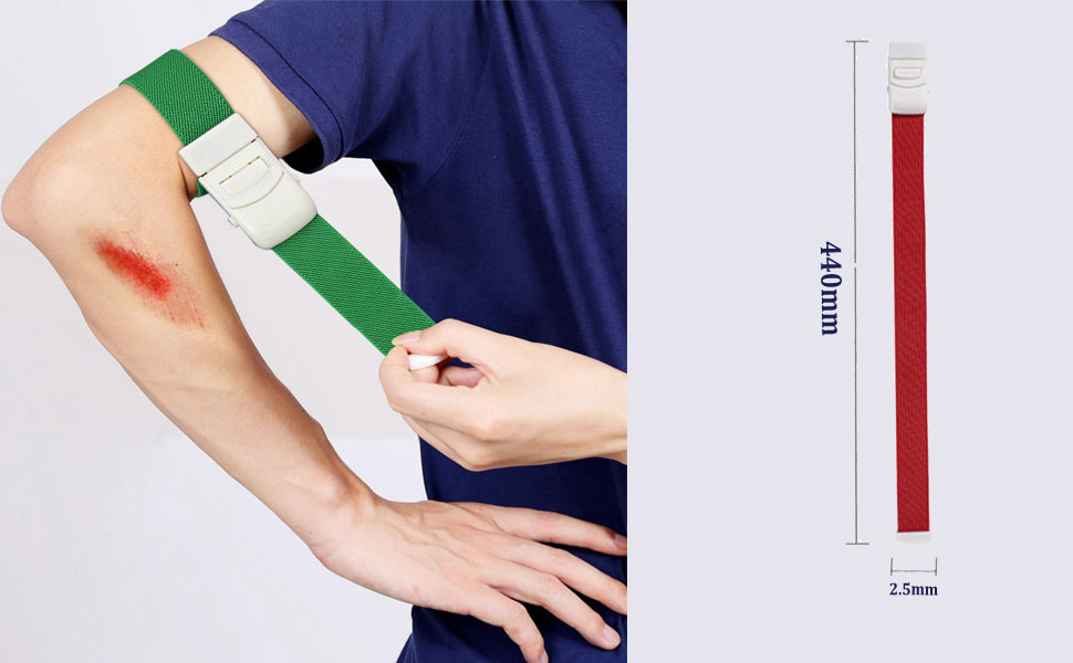 The WAYFIT Tourniquet pack includes 5 multi-colored, elastic arm tourniquets measuring 47cm by 2.5cm, each featuring a heavy-duty double lock plastic buckle for secure, adjustable fit. Individually packed and lightweight at 150g total, these non-sterile tourniquets are designed for efficient, reliable use in professional medical and industrial settings.