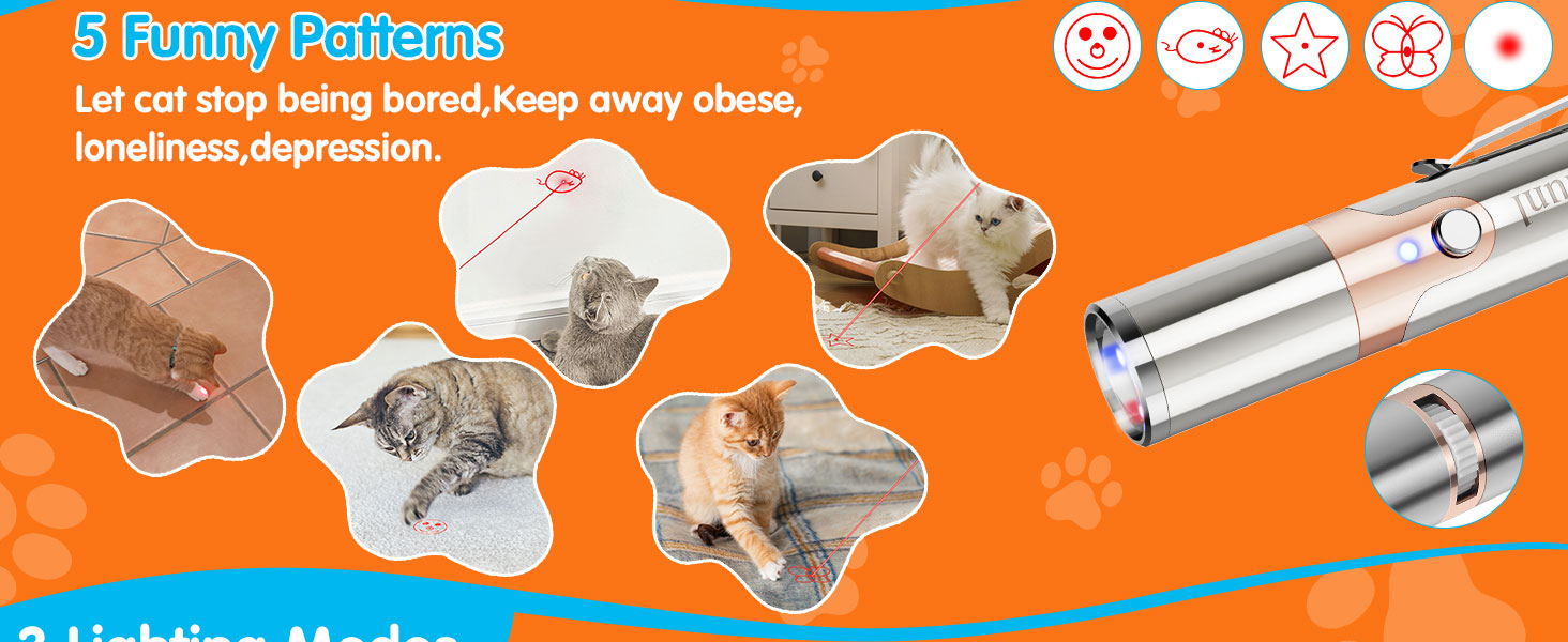 This USB rechargeable cat toy features 5 engaging red light patterns and 3 versatile light modes, designed with durable stainless steel and a portable clip for interactive indoor play with cats and dogs.