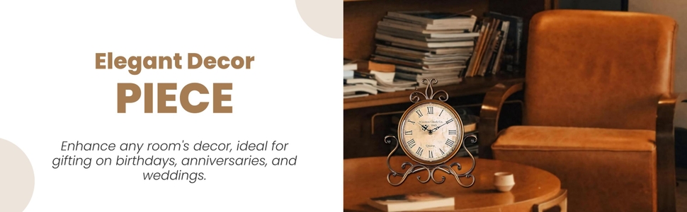 This 10-inch antique-style table clock features a silent quartz analog movement housed in a durable iron frame with a glass cover. Designed for indoor use, it combines vintage aesthetics with modern silent precision, making it a perfect decorative and functional piece for home or office desks. Battery powered (1 AA, not included), it offers a unique art deco flair and is an ideal gift for special occasions.