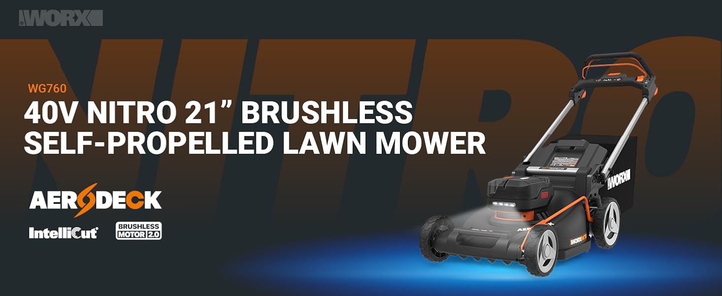 The WORX Nitro 40V 21" Cordless Lawn Mower combines innovative Aerodeck technology with a powerful brushless motor, offering a self-propelled experience with variable speed settings. Ideal for lawns up to 1/2 acre, it features Intellicut technology for efficient cutting and is compatible with the WORX PowerShare battery system, allowing for seamless use across multiple tools. With 3-in-1 functionality and easy storage options, this mower is designed for the modern homeowner.