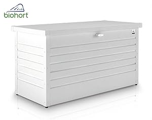The BIOHORT 130 Leisure Time Storage Container Box in white is a premium outdoor storage solution crafted from 0.5mm hot-dipped galvanized alloy steel. Featuring a reinforced flat lid with gas-assisted spring damper for easy opening, it offers weatherproof protection and a secure twist grip cylinder lock with a spare key. Sized at 140 x 74 x 8 cm and weighing 18 kg, it blends durability, security, and sleek design for the modern outdoor enthusiast.