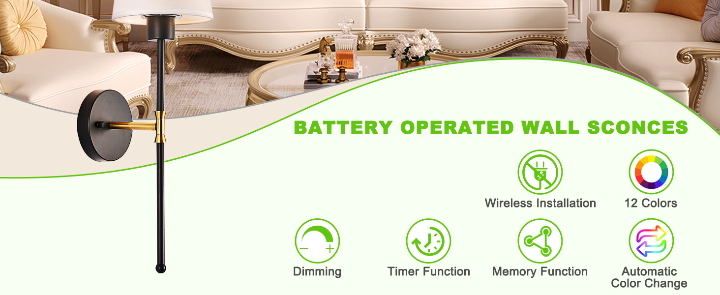The Depuley Battery Operated Wall Sconce set includes two rechargeable, wireless LED wall lights featuring 15 color options, adjustable brightness, and smart timer with memory function. Designed with a stylish black and gold metal finish, these easy-to-install sconces bring modern, customizable lighting to any indoor space without the hassle of wiring. Controlled remotely and backed by a 5-year warranty, they combine convenience, energy efficiency, and elegant design for the perfect ambiance.