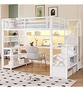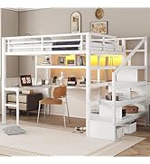 This queen size loft bed features a heavy-duty metal frame supporting up to 400 lbs, a 4-step staircase with built-in shelves, and a spacious under-bed area perfect for a workstation or storage. Designed with modern industrial aesthetics, it includes a compact wardrobe and bedside shelf, making it an ideal space-saving solution for adults, teens, and kids alike.