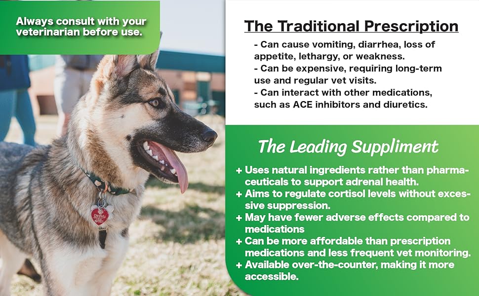 | Product Benefits | Dog Sleep Aid, Adrenal Support, Anxious Dog Relief, Improves Overall Well-Being, Coat supplement, Benefits dogs suffering from Cushing's disease |